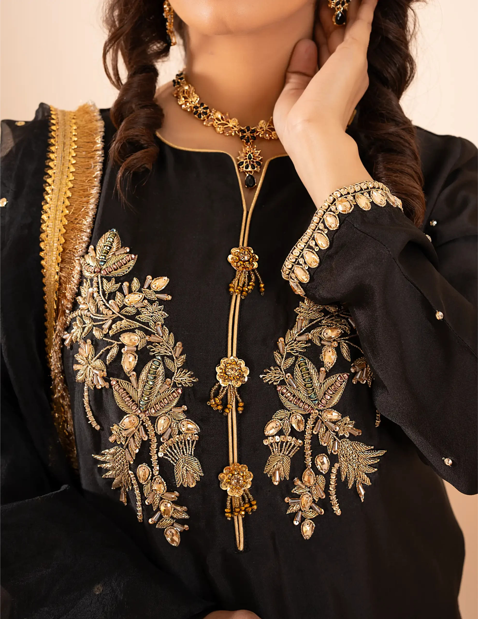 True to its name, Maharani embodies regal elegance with premium raw silk and graceful tailoring. The cotton silk trousers offer ease of movement, and the organza dupatta adds a sophisticated flow. A perfect ensemble for grand celebrations and formal gatherings.